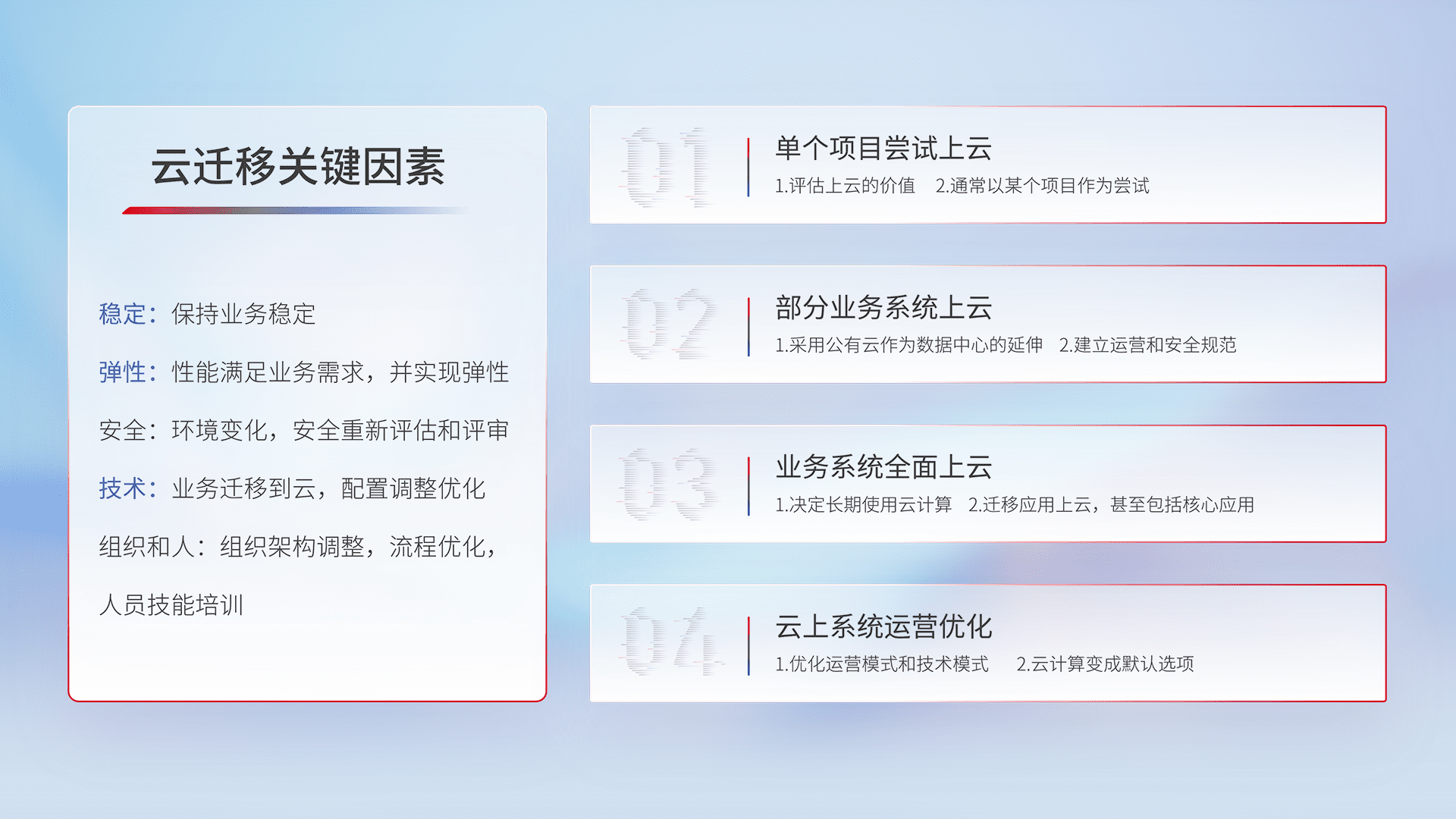 结合实际业务,,,,从规划设计、、云平台选型、、、云原生改造、、数据迁移、、、、集成交付,,,迁移全过程为客户识别最佳上云路径,,做好风险识别管理,,设计网络架构、、身份权限、、、安全审计合规、、、、操作审计、、日志审计、、监控告警策略、、、多站点容灾设计等,,,对云上基础设施进行整体规划,,,提升IT治理水平,,,,以满足弹性、、高可用、、、高性能的需求。。。。